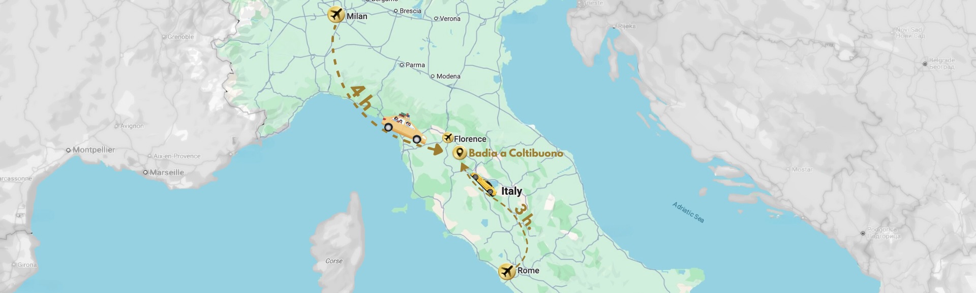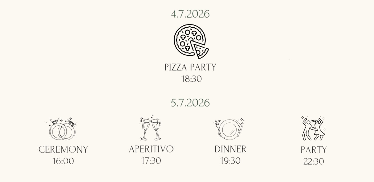 The wedding ceremony will take place on July 5, 2026 at Badia a Coltibuono. However, the celebration starts the day before! Please join us for the Welcome Pizza Party on July 4 at 18:00 — attendance is mandatory. The wedding ceremony itself will begin on July 5 at 15:30. Badia a Coltibuono is located in the heart of Tuscany — directions and details can be found here.